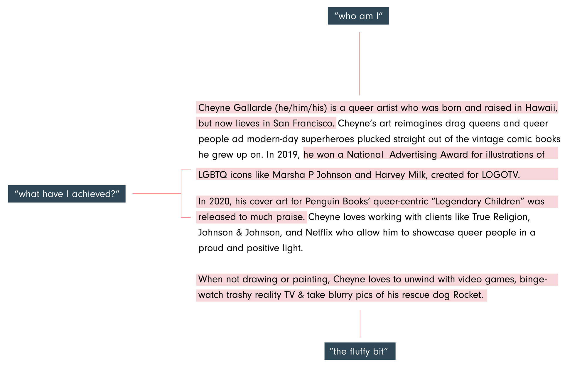 The third section adds personality and human connection. Sharing interests, inspirations, influences or unexpected personal details can help clients connect with you and imagine how you might engage with their projects.
